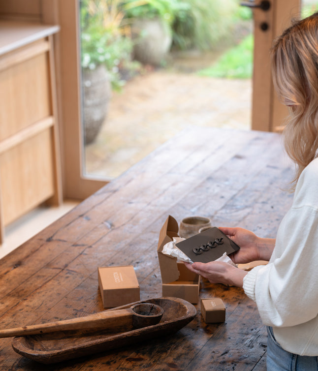 Nuestros productos se envuelven en papel de seda para protegerlos de cualquier rayón y las cajas se sellan con cinta de papel que se activa con el agua.