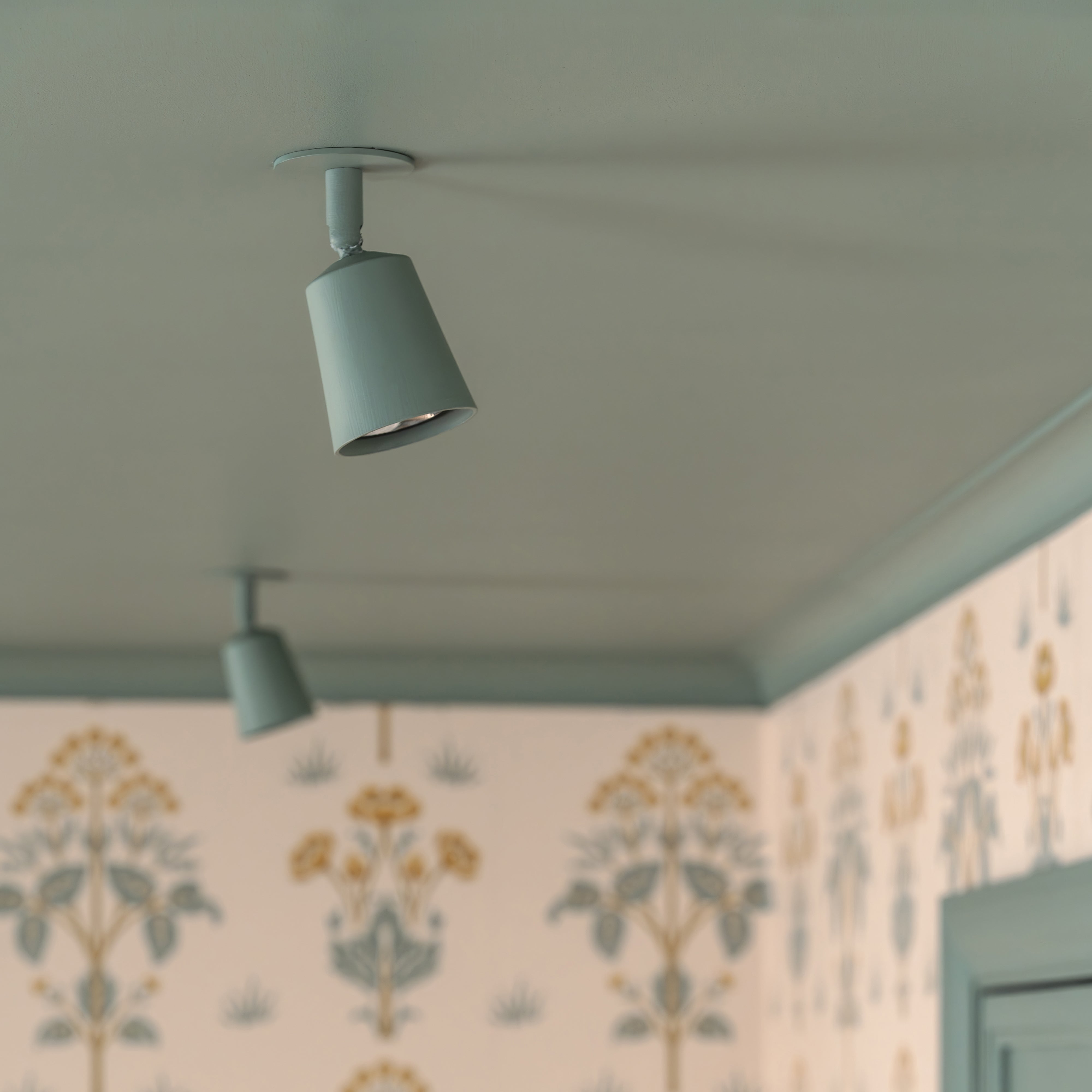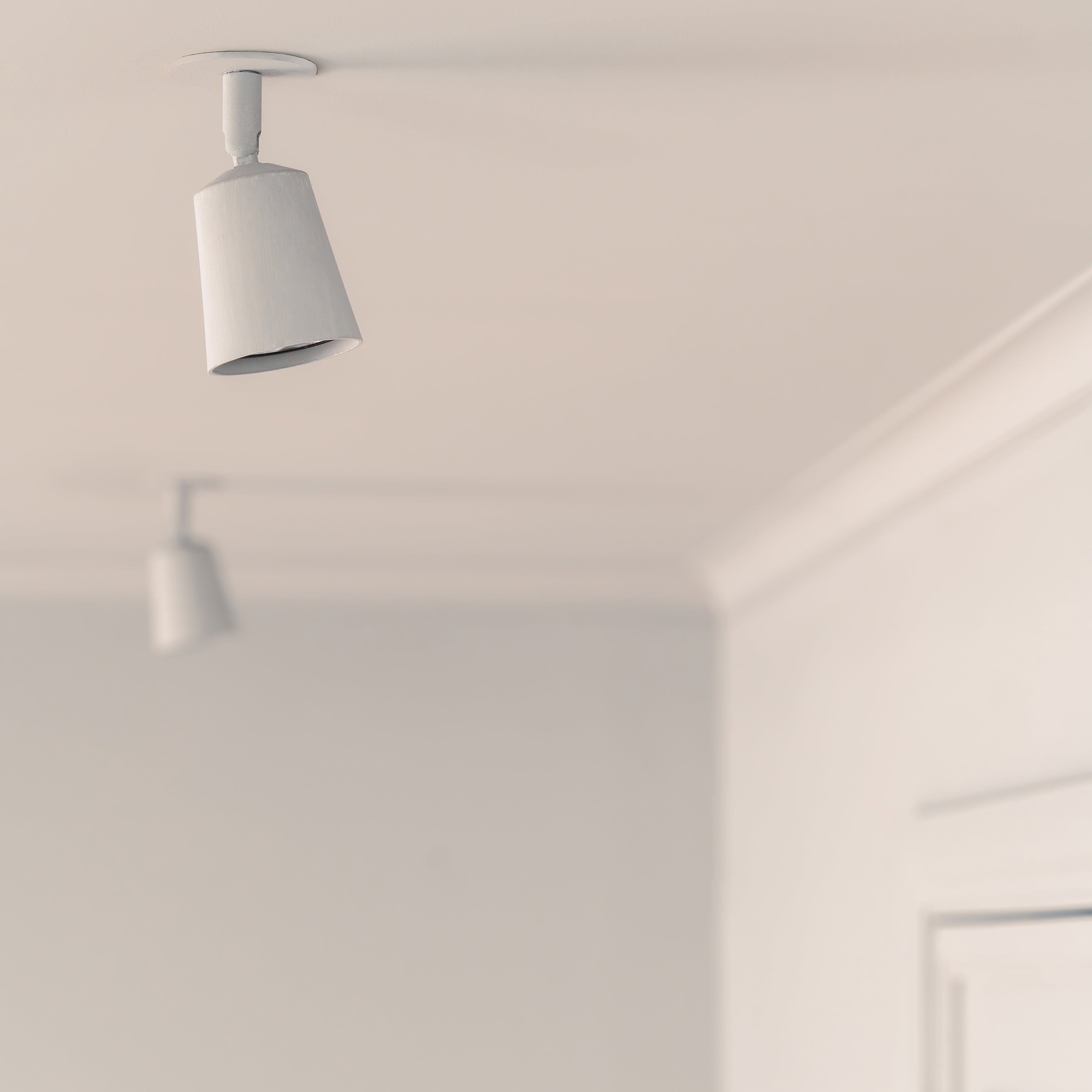 Nuestra lámpara para montar en superficies Pembroke puede inclinarse y rotarse 360 grados.