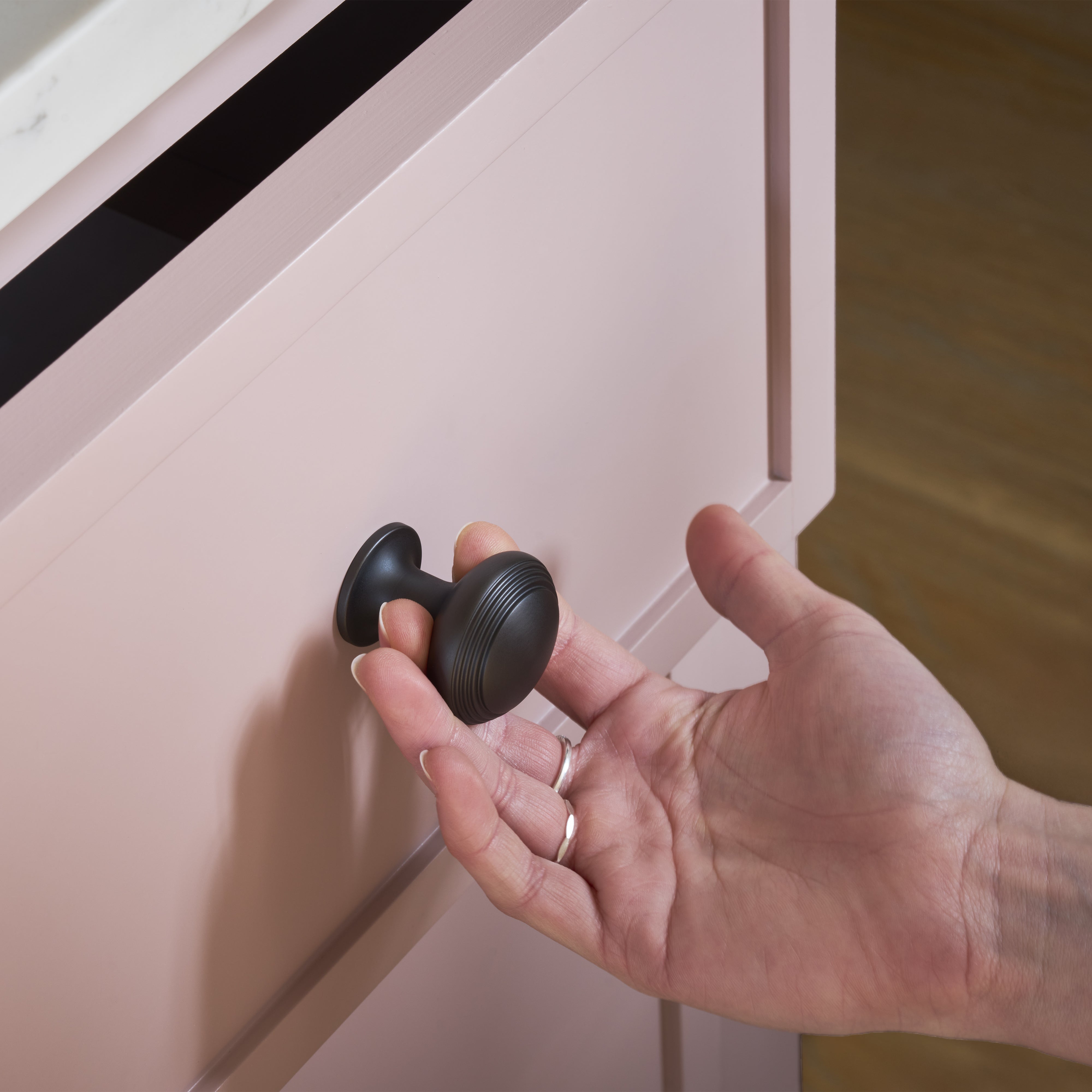 Nuestro tirador Barlow, atemporal y agradable al tacto, queda bien en alacenas de cocina, clósets y otros tipos de muebles.